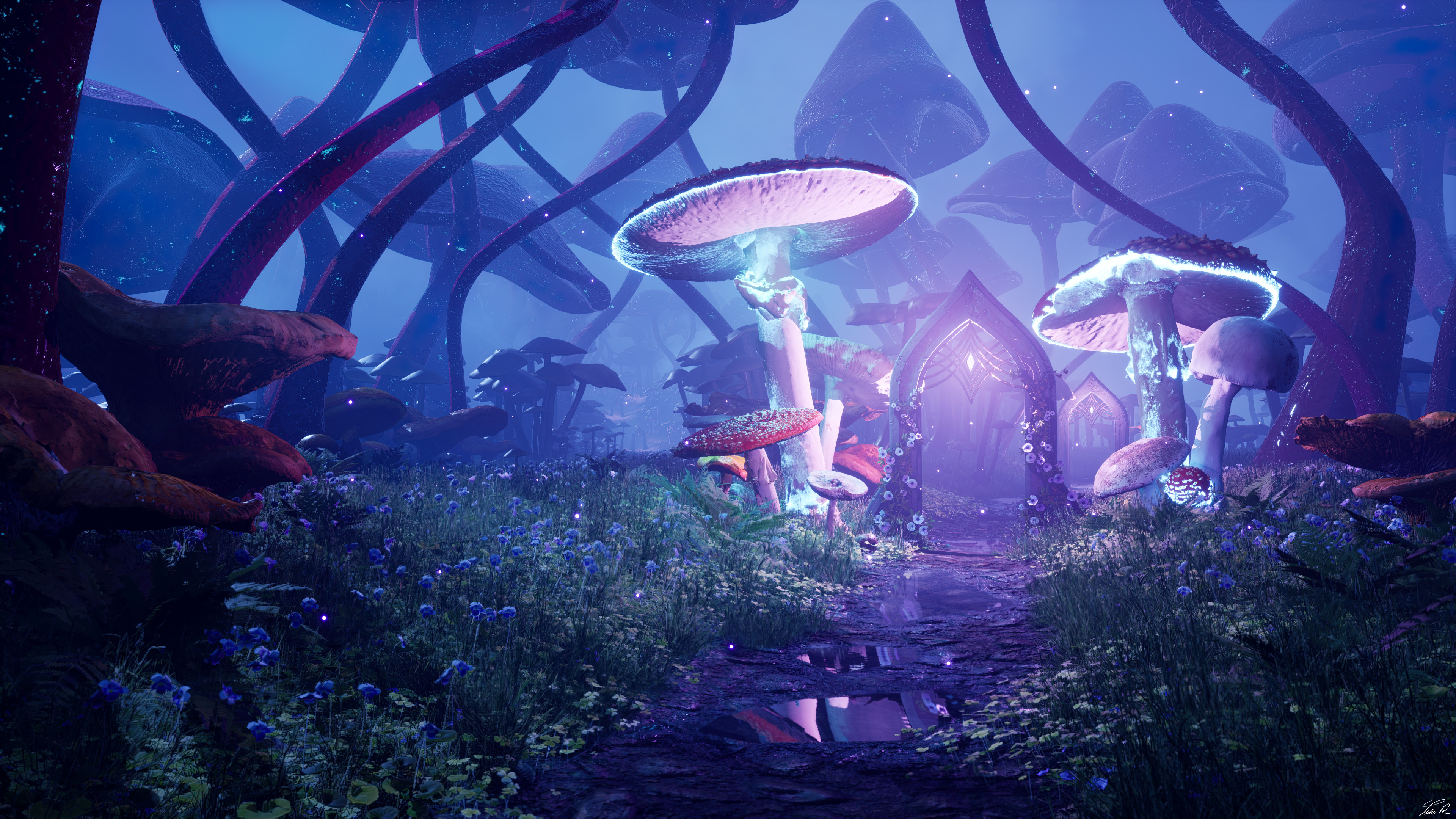 The large mushrooms and stone archways were modelled in Blender and textured in Substance Painter. The terrain was sculpted in Blender and textured in UE5 using Megascans assets. Foliage and medium-scale mushrooms are sourced from Megascans.