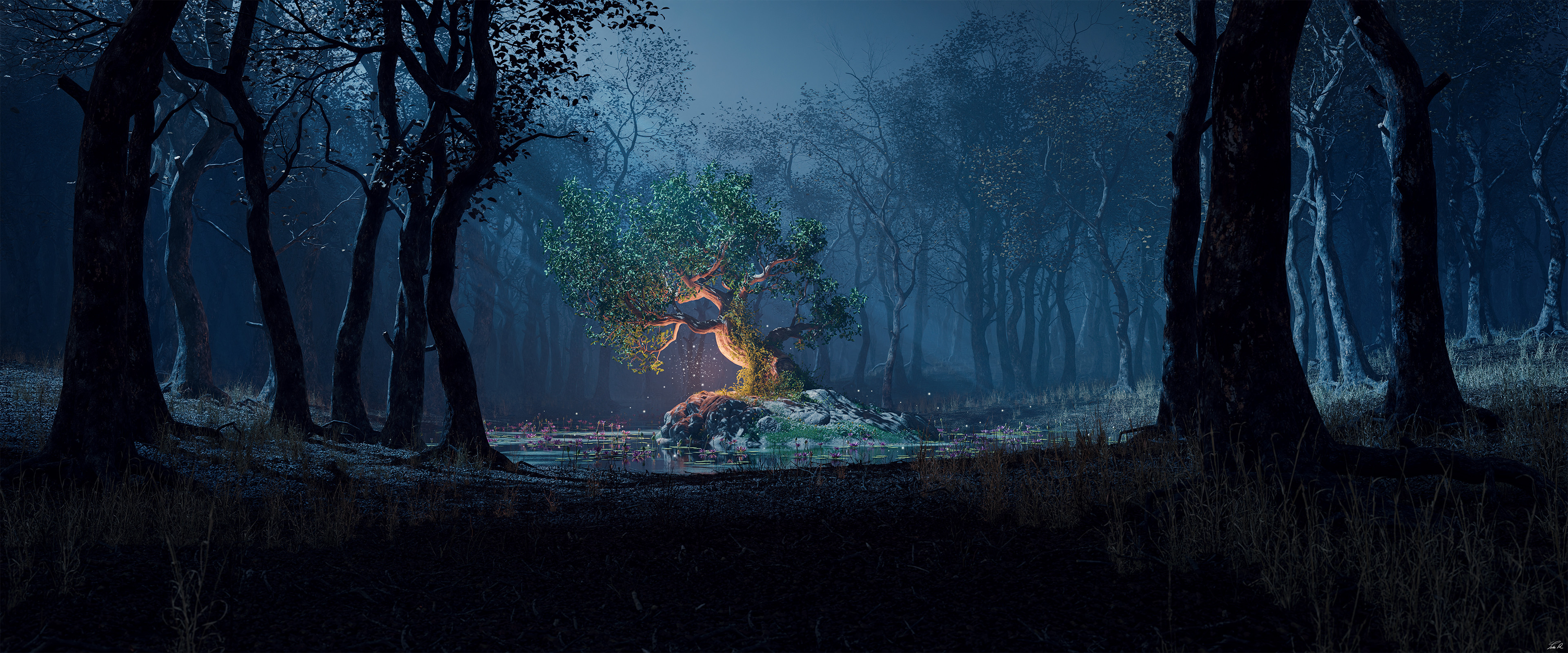 The trees were modelled in SpeedTree, with ground cover assets sourced from Quixel Megascans. Textures combine Megascans assets, Substance Painter work, and procedural shaders. The scene was composed and rendered in Blender.